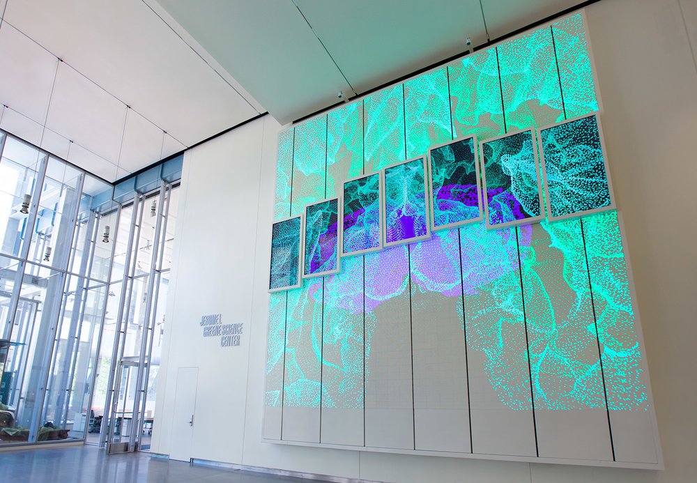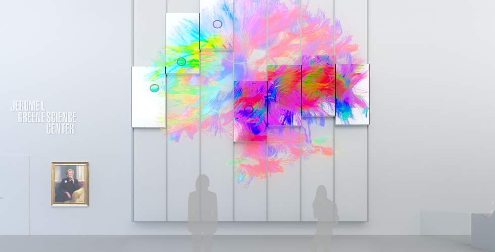 Pictured above are the series of active areas of the lobby. Most notably, the “Brain Index”, which is composed of a set of screens that move up to capture and then reveal the research happening in the larger brain above them. At key moments in the choreography, the tracking screens descend to the lobby visitors to engage with them through interactive research stories exploring cognition, sensory perception, decision making, learning and memory, addiction and reward, neural networks, and DNA sequencing.